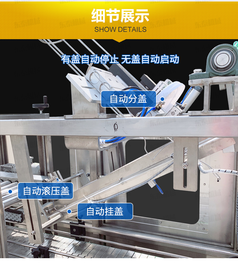 人工放蓋至料倉——自動剝離——自動吸蓋——自動掛蓋——自動滾壓蓋——自動出桶——一個循環(huán)完成。