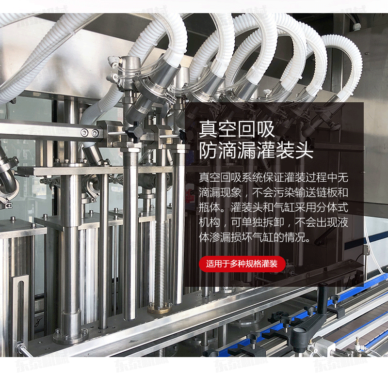 1.真空回吸系統(tǒng)保證灌裝過程中無滴漏現(xiàn)象,不會(huì)污染輸送鏈板和瓶體。灌裝頭和氣缸采用分體式機(jī)構(gòu),可單獨(dú)拆卸,不會(huì)出現(xiàn)液體滲漏損壞氣缸的情況。進(jìn)口亞德客氣缸經(jīng)久耐用,其他密封等配件使用標(biāo)準(zhǔn)件,更換維護(hù)簡(jiǎn)單方便。