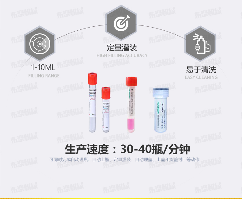 本機(jī)是在引進(jìn)和吸收國外技術(shù)的基礎(chǔ)上,由我公司自主研發(fā)的一款I(lǐng)VD診斷試劑灌裝旋蓋一體機(jī),能同時(shí)完成自動(dòng)理瓶、自動(dòng)上瓶、定量灌裝、自動(dòng)理蓋、上蓋和旋蓋封口等動(dòng)作。本機(jī)采用日本高精度封閉式凸輪分度工位器,精度高,運(yùn)行可靠,使用壽命長。該分度器結(jié)構(gòu)簡單,長期使用無需維修。該型號(hào)設(shè)備主要用于ⅣD體外診斷試劑制藥、生物制藥行業(yè)及科研領(lǐng)域裝。機(jī)器設(shè)計(jì)緊湊合理、外形簡潔美觀,灌裝量調(diào)節(jié)方便。