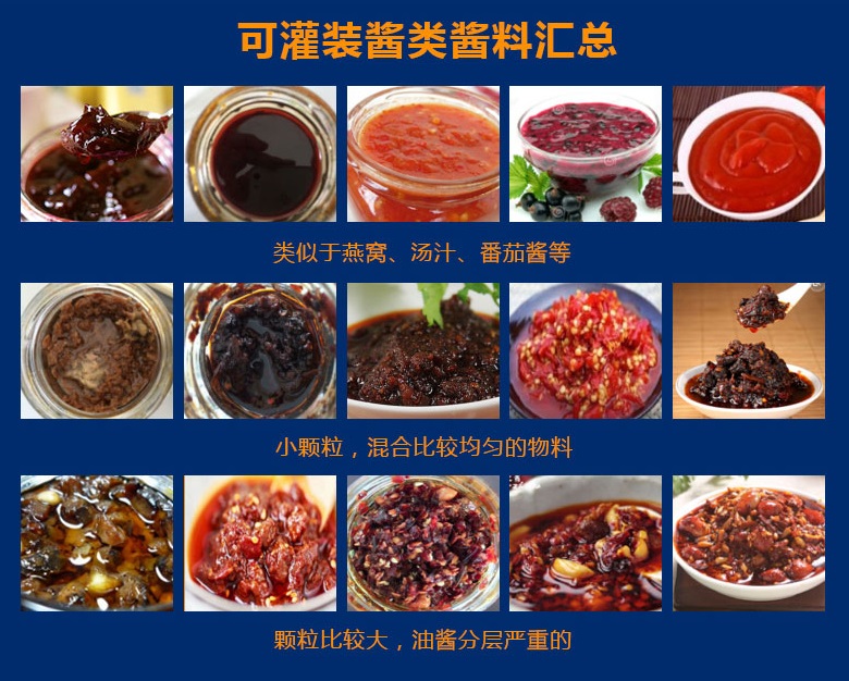 醬料灌裝生產(chǎn)線采用活塞式灌裝原理,適用于調(diào)味品中帶顆粒并且濃度較大的辣椒醬、豆瓣醬、花生醬、香菇醬、果醬、牛油火鍋底料、紅油火鍋底料、蝦醬等較為粘稠醬類(lèi)的灌裝。