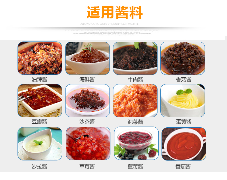 灌裝機采用活塞式灌裝原理,適用于調(diào)味品中帶顆粒并且濃度較大的辣椒醬、豆瓣醬、花生醬、香菇醬、果醬、牛油火鍋底料、紅油火鍋底料、蝦醬等較為粘稠醬類的灌裝。