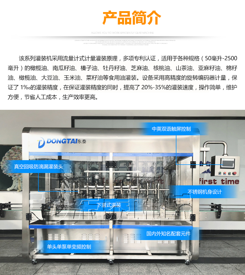 東泰機(jī)械至今有著二十年的研發(fā)生產(chǎn)經(jīng)驗(yàn),擁有著精良的技術(shù)團(tuán)隊(duì),東泰研發(fā)的橄欖油自動灌裝機(jī),橄欖油灌裝流水線都是機(jī)電一體的新型設(shè)備,橄欖油自動灌裝機(jī)計量采用高精度流量計與微電子數(shù)控儀表相結(jié)合的方式,灌裝精度相當(dāng)高,還可以方便的進(jìn)行無級調(diào)解灌裝容量,非常直觀,操作非常簡單。選擇包裝設(shè)備就要選經(jīng)驗(yàn)豐富、技術(shù)超前,設(shè)備完善的的大企業(yè),東泰機(jī)械通過二十多年的努力和發(fā)展,現(xiàn)已成為集科研、設(shè)計制造、成套供應(yīng)、技術(shù)咨詢服務(wù)、工程總承包為一體的高科技型企業(yè)。東泰期待與您的合作,我們互利共贏!