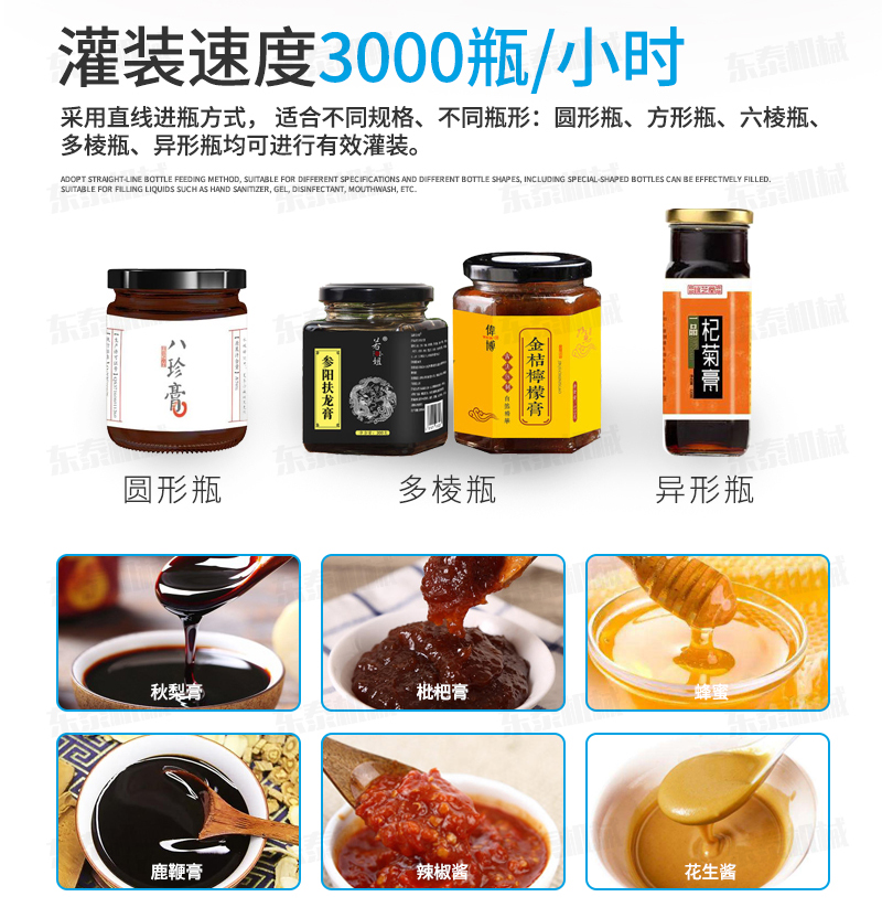 另外我們東泰公司可根據(jù)客戶自己的所需進(jìn)行選擇,公司主打產(chǎn)品有醬料灌裝機(jī),自動(dòng)灌裝機(jī),液體灌裝機(jī),灌裝生產(chǎn)線,等等設(shè)備提供個(gè)性化定制服務(wù),不僅能夠使膏體自動(dòng)灌裝機(jī)更好的對(duì)產(chǎn)品實(shí)行包裝,也是對(duì)企業(yè)發(fā)展的一種責(zé)任,根據(jù)目前以快節(jié)奏為標(biāo)準(zhǔn)的社會(huì)市場(chǎng)來講,采用電腦控制的膏體自動(dòng)灌裝機(jī)加工生產(chǎn)流水線灌裝準(zhǔn)確,精度達(dá)0.2%,這就給與膏體產(chǎn)品的生產(chǎn)幫了一個(gè)大忙。